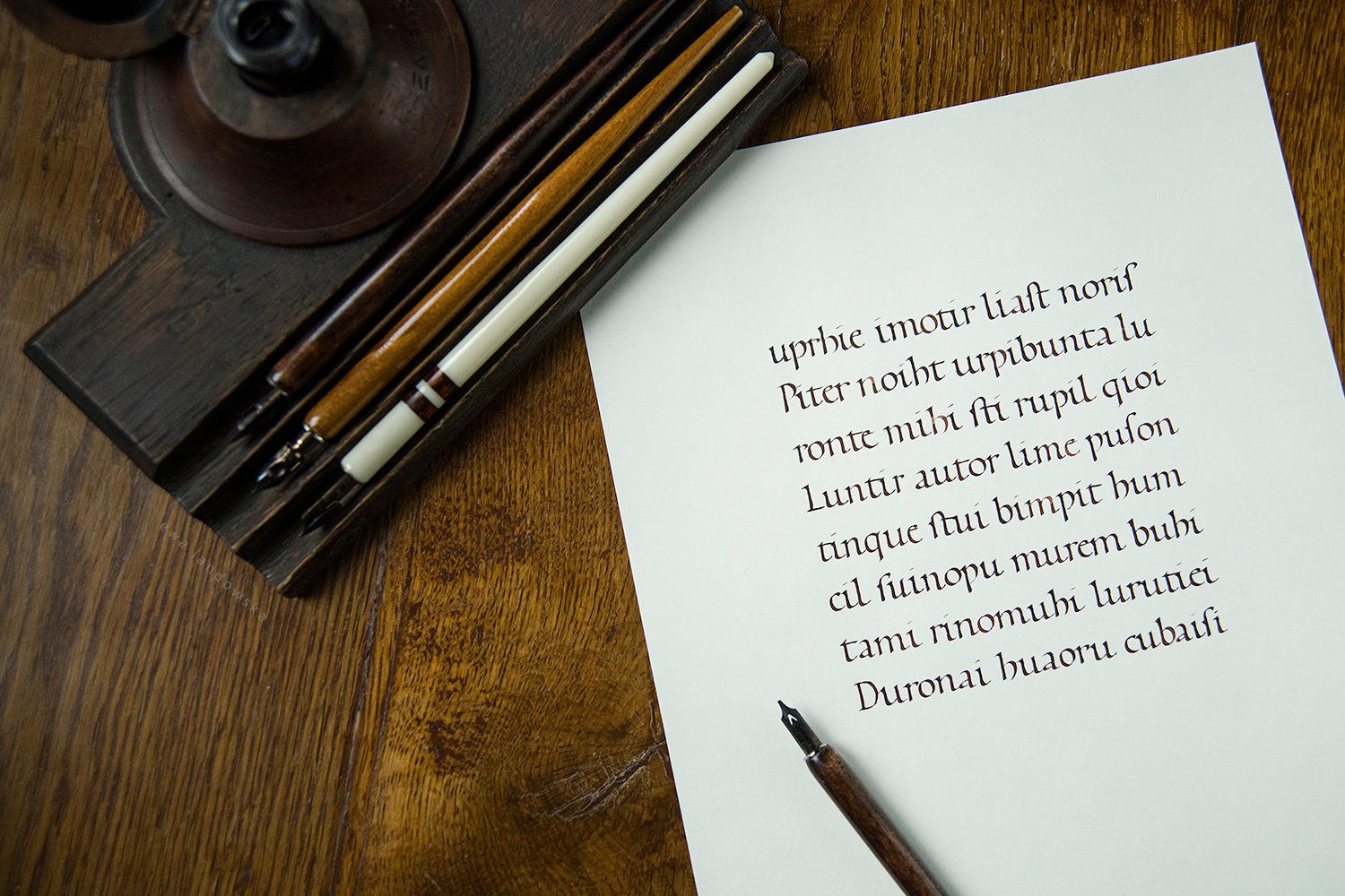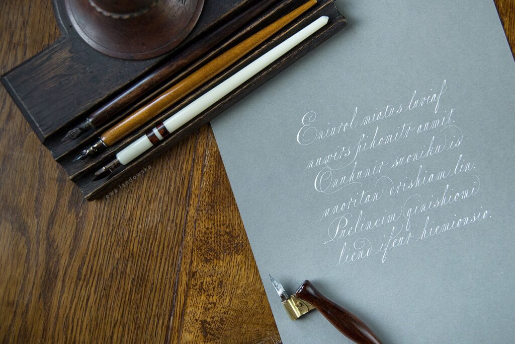 Warsztaty przeznaczone są dla osób zarówno początkujących, jak i zaawansowanych. Na czas zajęć udostępniam wszelkie potrzebne materiały do pracy: papier, atrament, obsadki, stalówki.