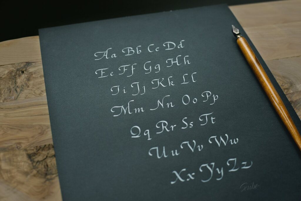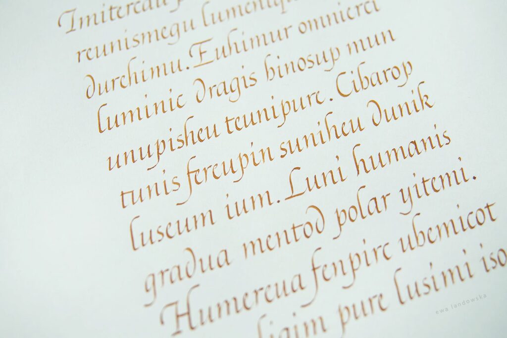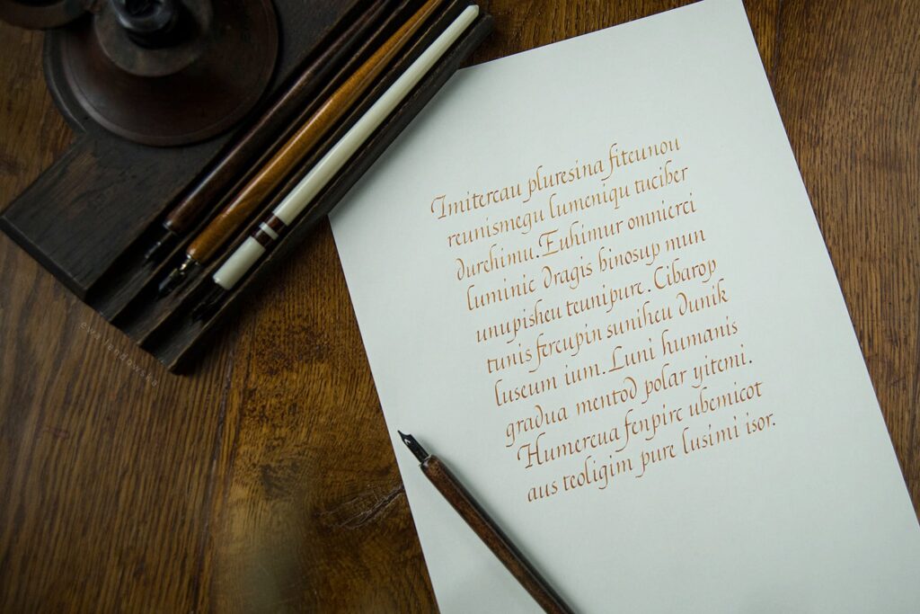 Warsztaty przeznaczone są dla osób zarówno początkujących, jak i zaawansowanych. Na czas zajęć udostępniam wszelkie potrzebne materiały do pracy: papier, atrament, obsadki, stalówki.