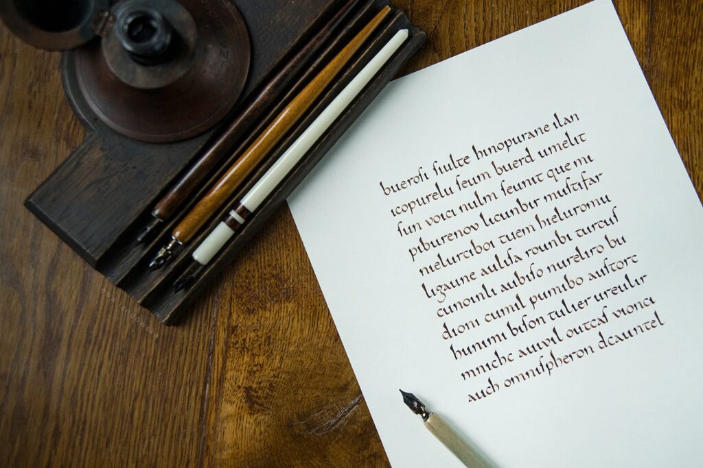 Warsztaty przeznaczone są dla osób zarówno początkujących, jak i zaawansowanych. Na czas zajęć udostępniam wszelkie potrzebne materiały do pracy: papier, atrament, obsadki, stalówki.