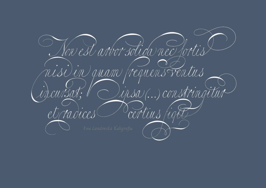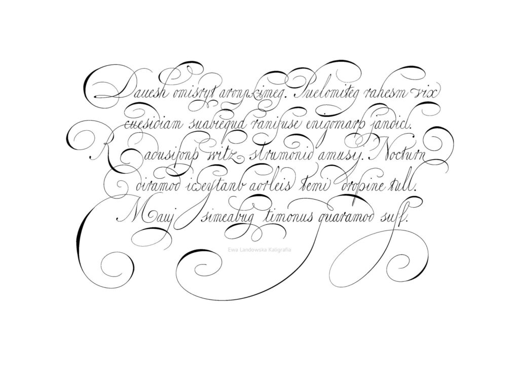 Warsztat inspirowany twórczością Jana van de Velde to barok w najczystszej postaci: bogaty, wyrazisty, pełen fantazyjnych form i ornamentów. To styl, w którym kaligrafia staje się niemal „sztuką dla sztuki” — efektowną, pełną przepychu, świadomie przesadzoną. Jednocześnie właśnie dzięki pracy z tak rozbudowaną estetyką uczymy się panowania nad formą, wyczucia umiaru i harmonii w nadmiarze.